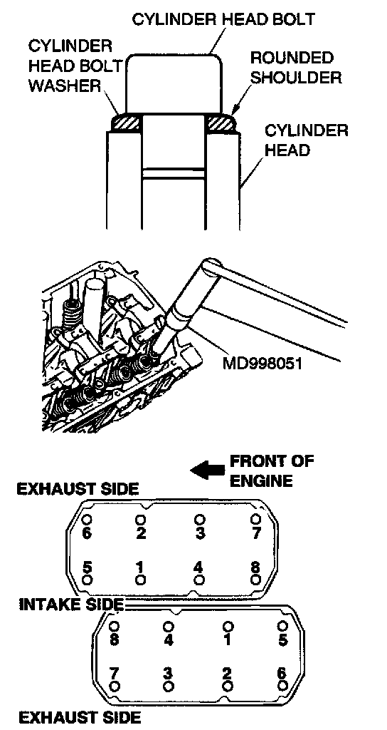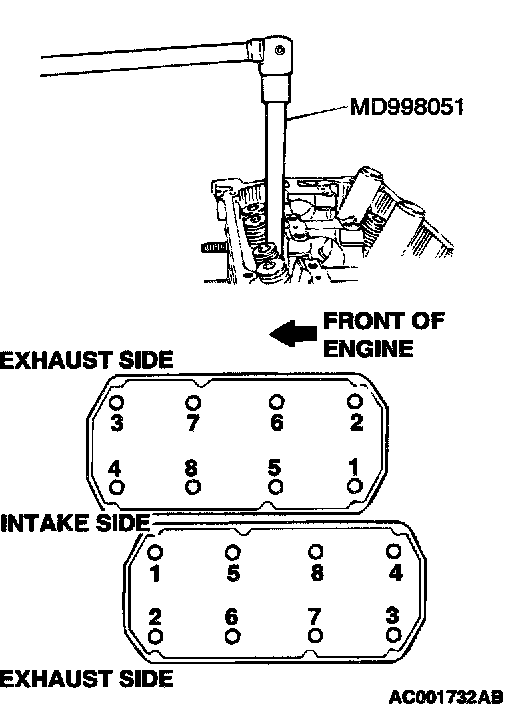 2. Using special tool MD998051 and a torque wrench, tighten the bolts to the specified torque in the order. (in two or three steps).