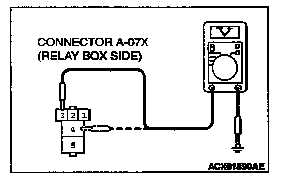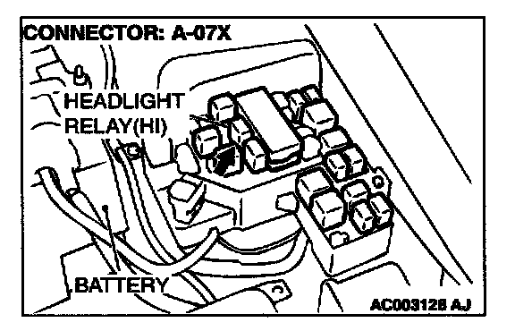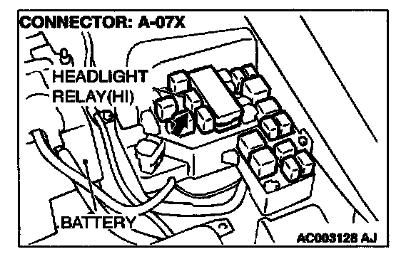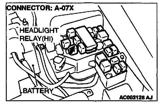 1. Disconnect the headlight relay (high) connector A-07X and measure at the relay box side.