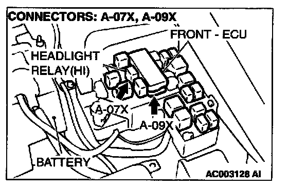 STEP 9. Check the harness wire between headlight relay (high) connector A-07X and front-ECU connector A-09X.