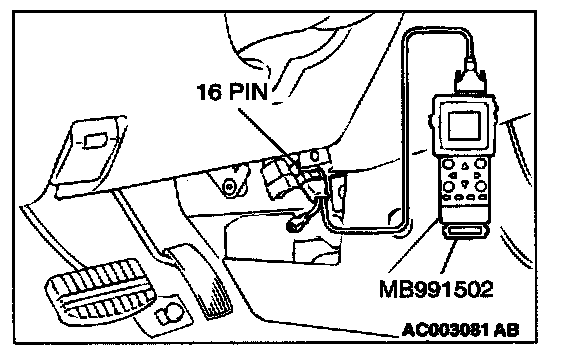 CAUTION: To prevent damage to scan tool MB991502, always turn the ignition switch to the "LOCK" (OFF) position before connecting or disconnecting scan tool MB991502.