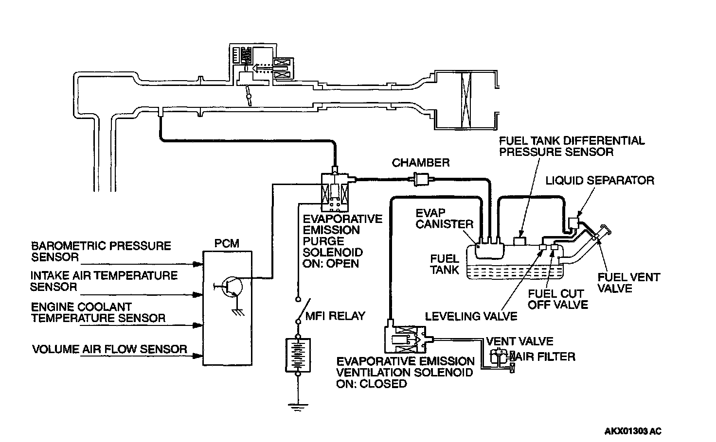 An EVAP ventilation solenoid is provided between the EVAP canister and atmosphere to monitor for OBD-II EVAP leaks. This solenoid is normally OFF. However, it turns ON when monitoring the OBD-II EVAP leaks and shuts off the atmosphere flow to the EVAP canister. Then the fuel tank differential pressure sensor monitors the fuel vapor pressure to detect OBD-II EVAP leaks. The fuel vent valve and the leveling valve prevent fuel from being overfilled. The fuel vent valve and the leveling valve prevents fuel leaks just if the vehicle is rolled over in an accident.