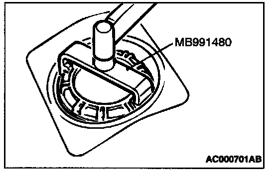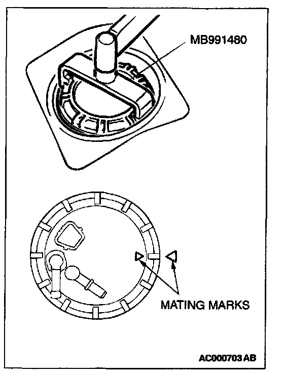 7. Use special tool MB991480 to align the mating marks on the fuel tank and fuel pump module, and tighten the cap.