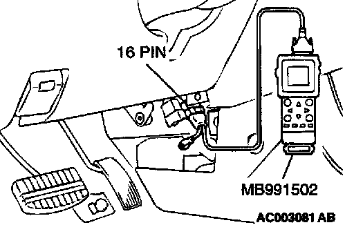 CAUTION: To prevent damage to scan tool MB991502, always turn the ignition switch to the "LOCK" (OFF) position before connecting or disconnecting scan tool MB991502.