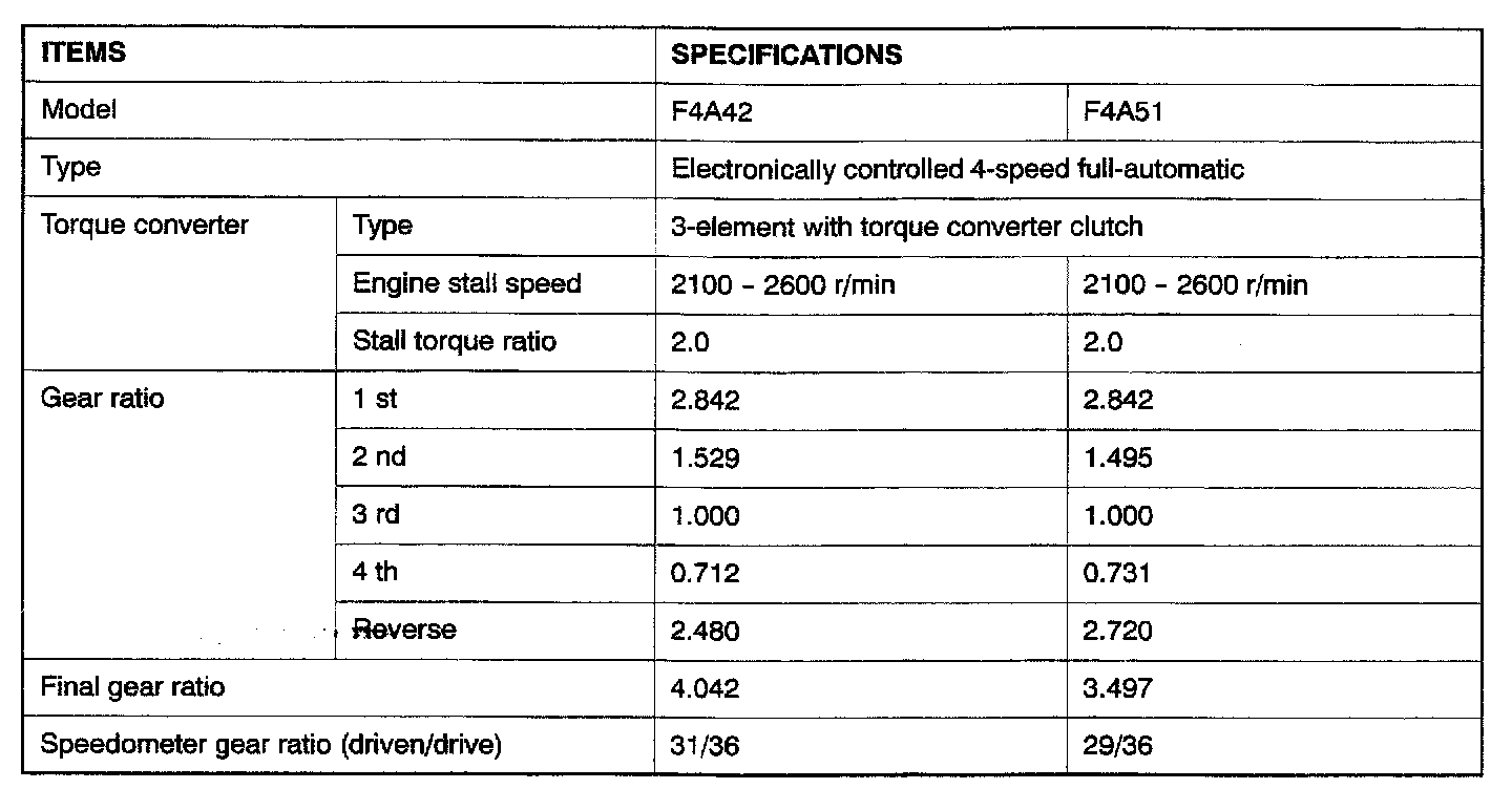 F4A42/F4A51 4-spd A/T, Gear Ratios: