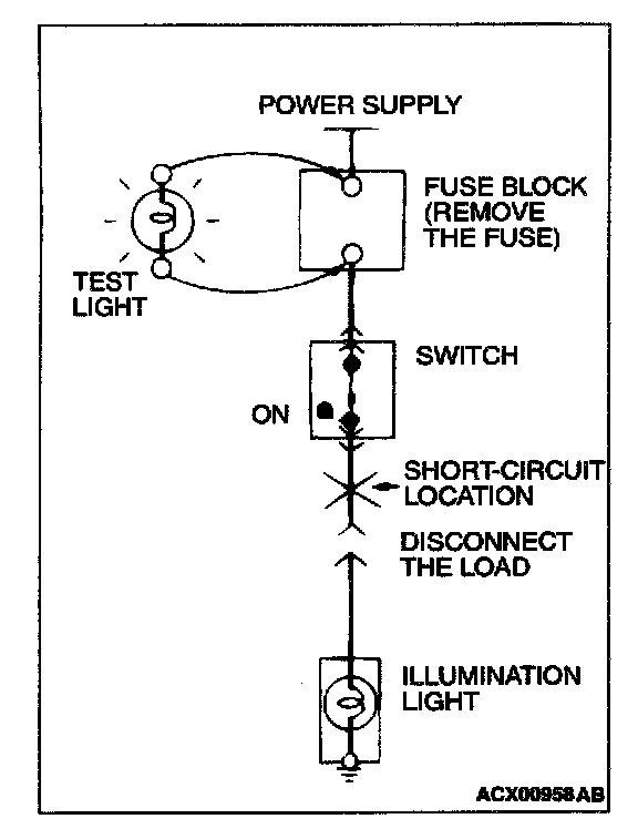 STEP 1. Remove the blown fuse and connect the test light across the fuse terminals (Switch: OFF).