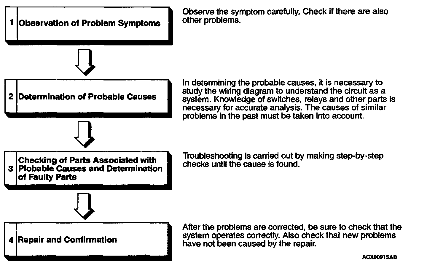 If an attempt is made to solve a problem without going through correct steps for troubleshooting, the symptoms could become more complicated, resulting in failure to determine the causes correctly and making incorrect repairs. The four steps below should be followed in troubleshooting.