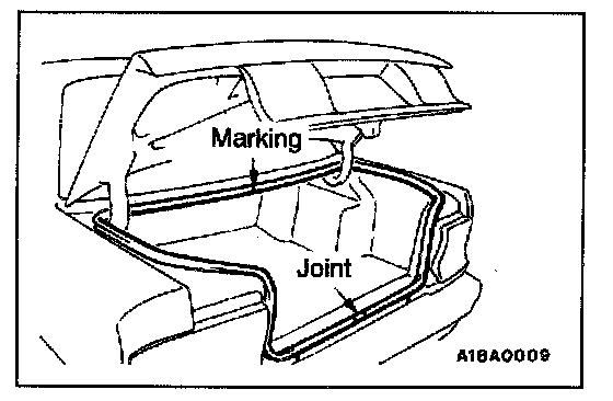 Install the trunk lid weatherstrip so that the marking and the joint are aligned with the body center line.