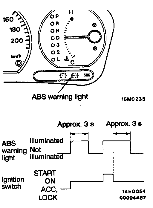 3. When the ignition key is released from the "START" position, the ABS warning light illuminates for approximately 3 seconds and then switches off.