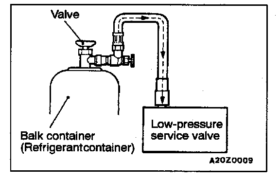 CAUTION: If the bulk container is inverted, liquid refrigerant may be drawn into the compressor damaging it by hydraulic lock. Keep the bulk container upright to ensure that refrigerant is charged In gas state.