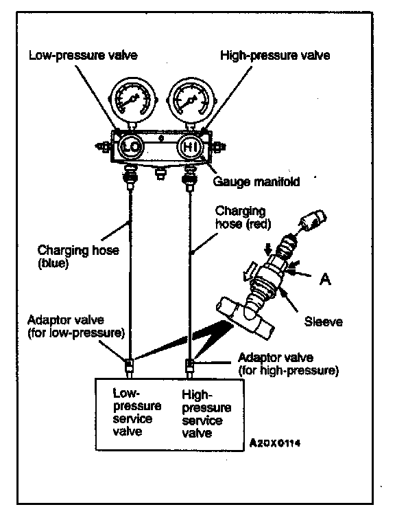 3. Connect the charging hose (blue) to the low-pressure valve and connect the charging hose (red) to the high-pressure valve of the gauge manifold.