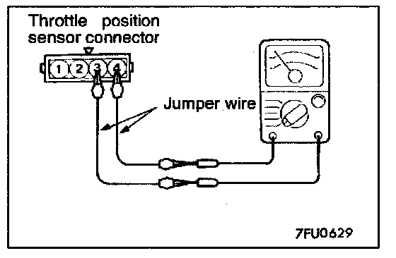 2. Connect an ohmmeter between terminal 3 (closed throttle position switch) and 4 (sensor ground) by using jumper wires.