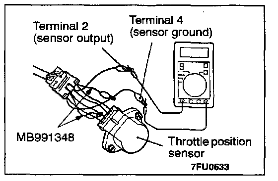 2. Connect a digital voltmeter between the throttle position sensor terminal 2 (sensor output) and terminal 4 (sensor ground.)