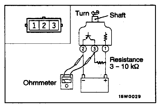 2. Turn the shaft of the vehicle speed sensor and check that there is voltage between terminals 2 - 3. (1 turn = 4 pulses)