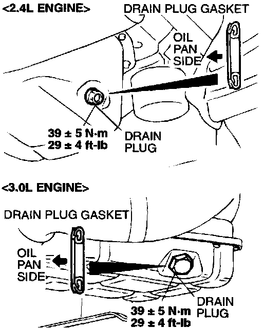 4. Install a new drain plug gasket so that it faces in the direction shown in the illustration, and then tighten the drain plug to the specified torque.