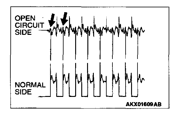 Current is not supplied to the motor coil on the open circuit side. (Voltage does not drop to 0 volt.) Furthermore, the induced electromotive force wave pattern at the normal side is slightly different from the normal wave pattern.