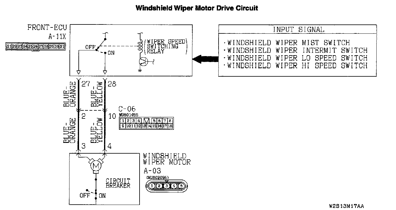 Windshield Wiper and Washer: The Windshield Wipers do not Work When the Windshield Wiper Switch is at "INT" or "MIST" Position or the Windshield Washer Switch is at "ON" Position. However, the Wipers Work at Low Speed when the Windshield Wiper Switch is at "LO" or "HI."