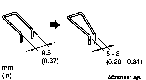 1. Make sure that there is no excessive play at the shift cable end clip. If there is excessive play or the clip is disengaged from the shift cable end, check the clip opening gap. If the gap is more than 9.5 mm (0.37 inch), squeeze the clip until the relaxed gap reaches 5 to 8 mm (0.20 to 0.31 inch).