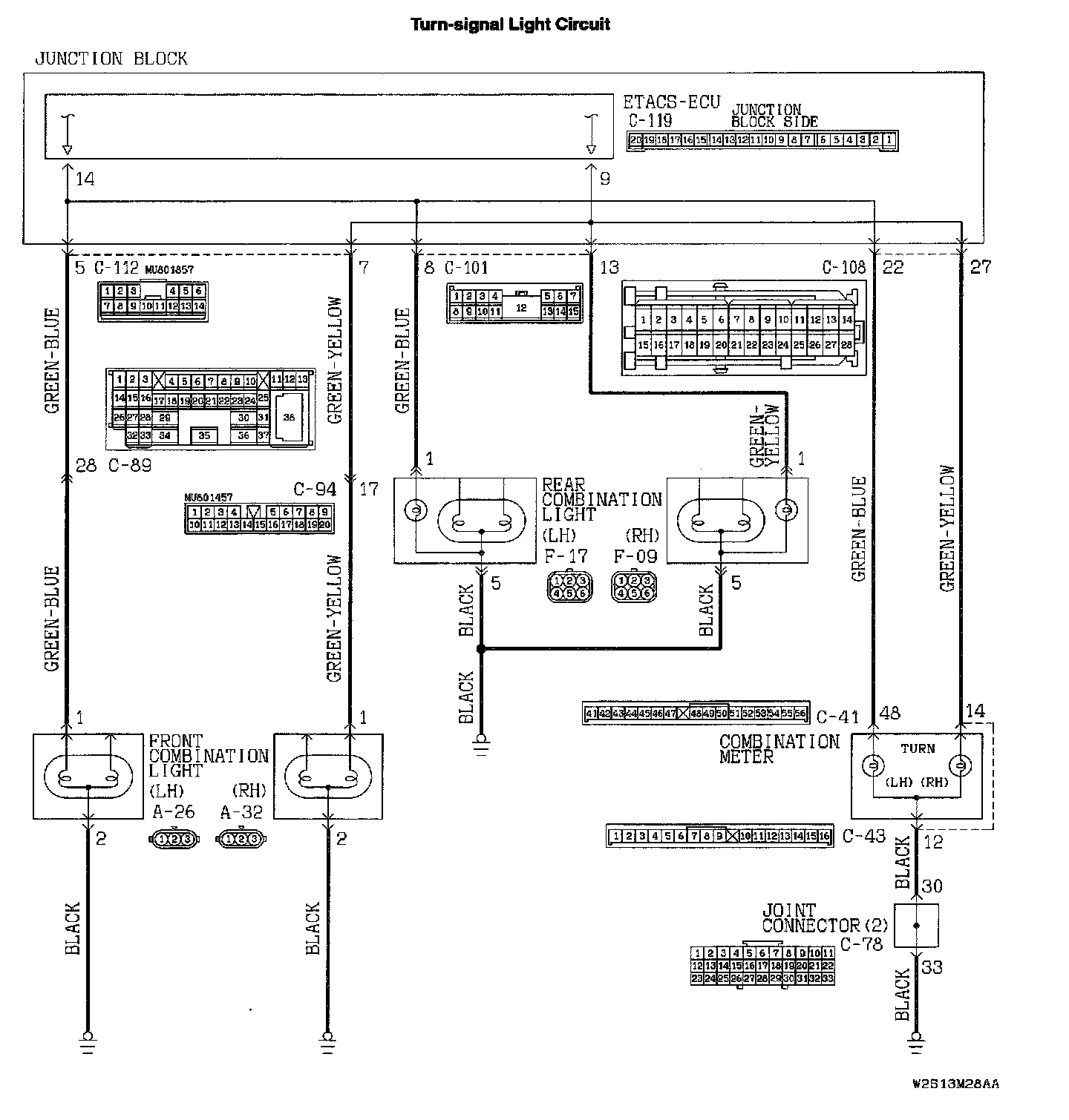 STEP 12. Check front combination light (RH) connector A-32 and ETACS-ECU connector C-119 for damage.