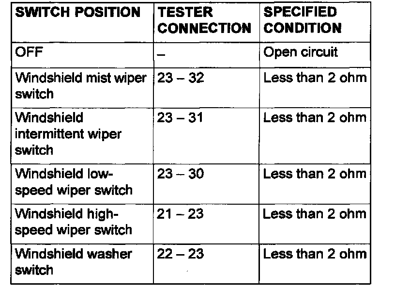 Remove the windshield wiper and washer switch. Then check continuity between the switch terminals.