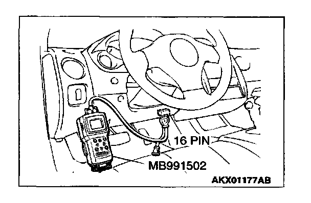 CAUTION: To prevent damage to scan tool MB991502, always turn the ignition switch to the "LOCK" (OFF) position before connecting or disconnecting scan tool MB991502.