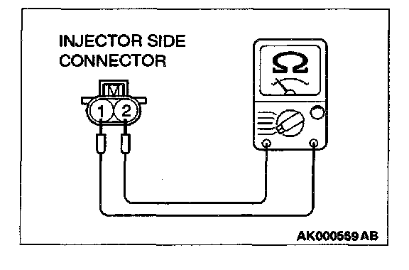 2. Measure the resistance between each injector side connector terminal 1 and 2.