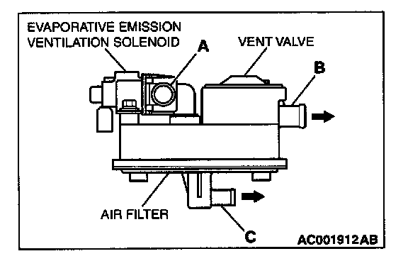 OVER VENT VALVE MODULE CHECK1. Blow air through OVER vent valve module nipple (A). Check that the air flows out of nipple (B) and nipple (C).