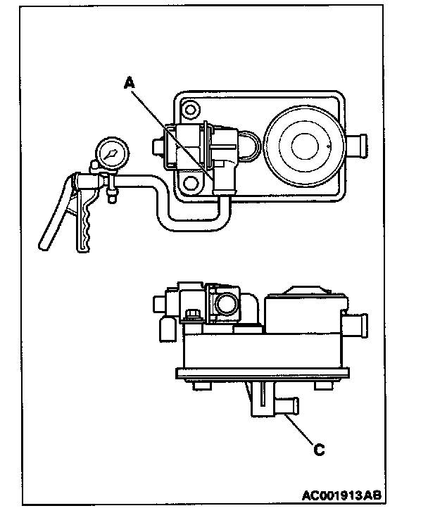 3. With air flow through nipple (C) obstructed, apply a vacuum and check that the vacuum is maintained,