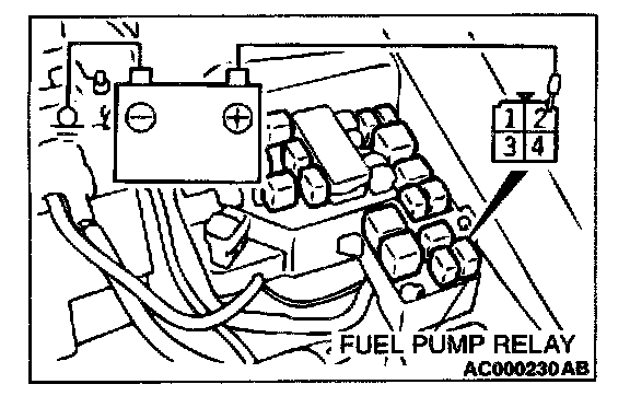 2. Remove the fuel pump relay, and apply battery voltage to harness-side connector terminal number 2. Check that an operating sound can be heard from the fuel pump.
