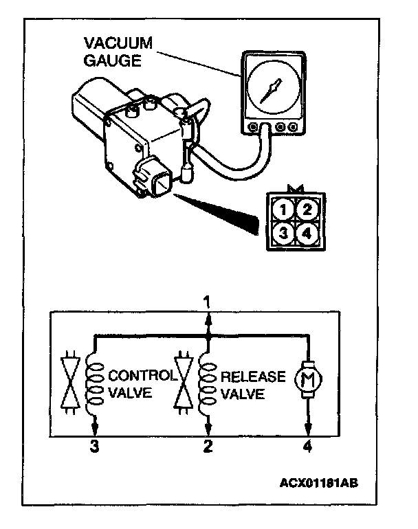 1. Connect the positive battery terminal to auto-cruise vacuum pump connector terminal 1, and the negative battery terminal to terminals 2, 3, and 4. Then the vacuum gauge should read 27 kPa (8.0 inHg) or more.