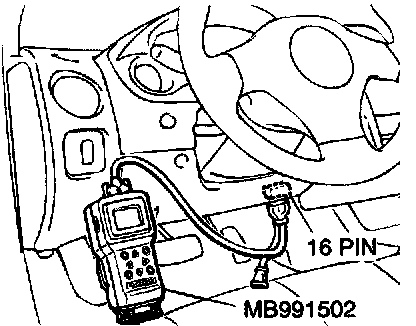 CAUTION: To prevent damage to scan tool MB991502, always turn the ignition switch to the "LOCK" (OFF) position before connecting or disconnecting scan tool MB991502.