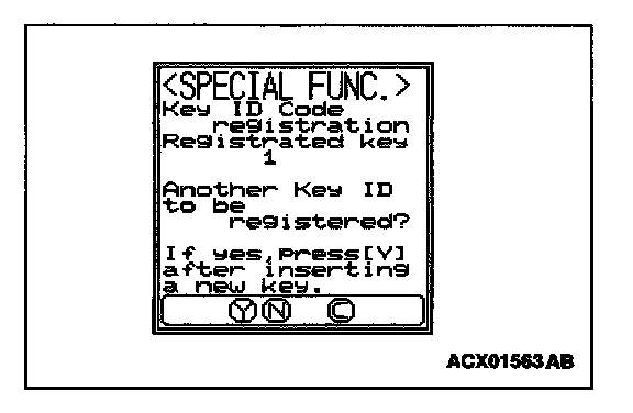 10. The number of keys currently registered will be displayed. To register an additional key, replace the ignition key with the next key to be registered within five seconds and then press the "YES" key. Key ID registration screen will be displayed, then register another key.
