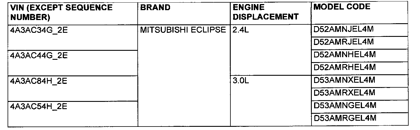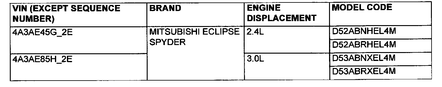 Vehicle Identification Number List - Eclipse Spyder: