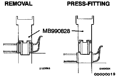 1. Use special tool MB990828 to drive out and press-fit the crossmember bushing C.