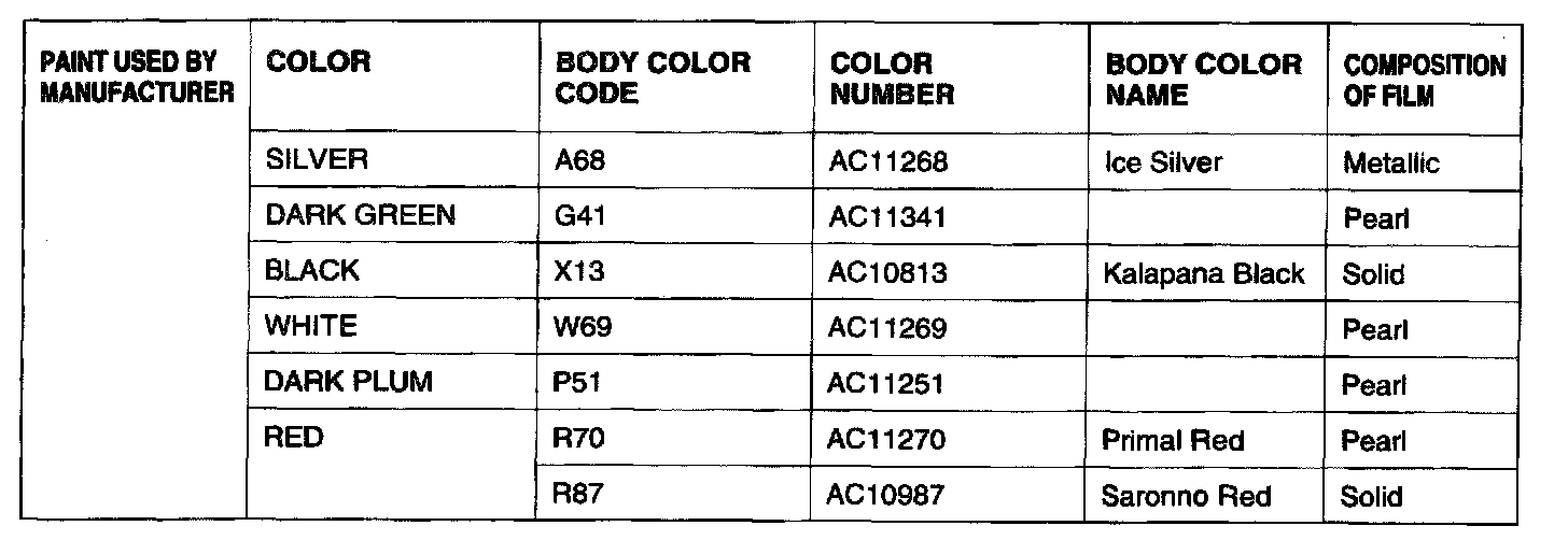 Check the vehicle's body color code and then use this body color chart to determine the refinishing