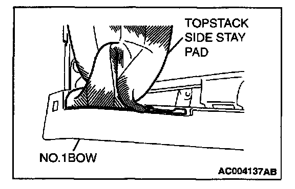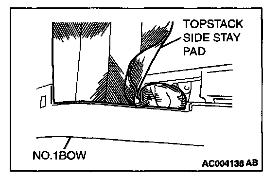 4. Working from inside the vehicle, pull out the folded end of the topstack side stay pad, and then install the topstack side stay pad to the No.1 bow.