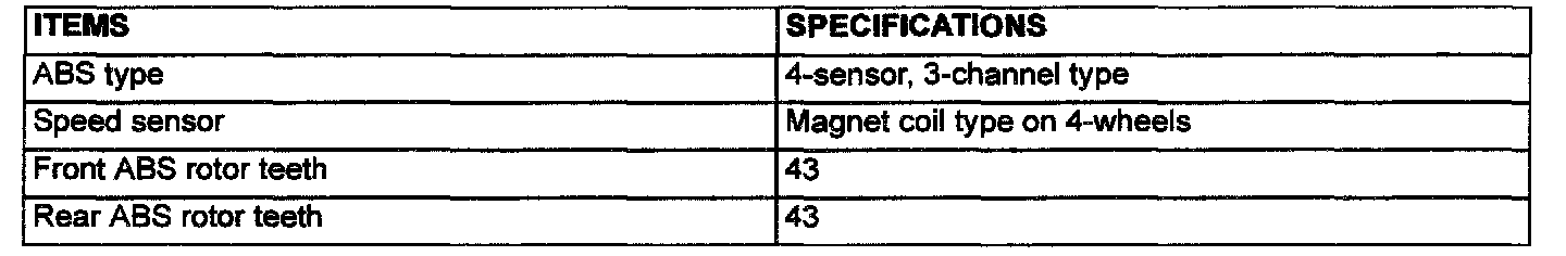 GENERAL DESCRIPTIONThe ABS consists of components such as the wheel speed sensors, stoplight switch, hydraulic unit assembly (integrated with ABS-ECU),ABS rotor, and the ABS warning light. If a problem occurs in the system, the malfunctioning components can be identified and the trouble symptoms will be memorized by the diagnostic function. In addition, reading of diagnostic trouble codes and data list and actuator testing are possible by using the Scan Tool.