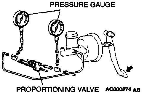 PROPORTIONING VALVE FUNCTION TEST1. Connect two pressure gauges, one each to the input side and output side of the proportioning valve, as shown.