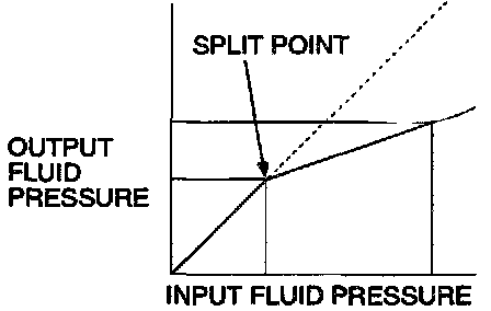 1. Output fluid pressure begins to drop relative to input fluid pressure (split point).