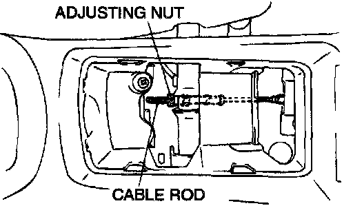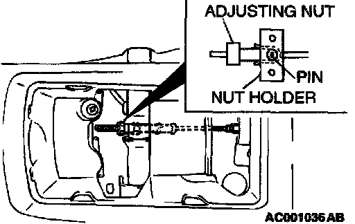 3. Remove the floor console cup tray or arm rest assembly, loosen the adjusting nut as far as the end of the cable rod to release the cable, and then adjust by the following procedure: