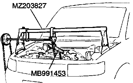 3. Remove the chain block and support the engine assembly with special tools MB991453 and MZ03827.