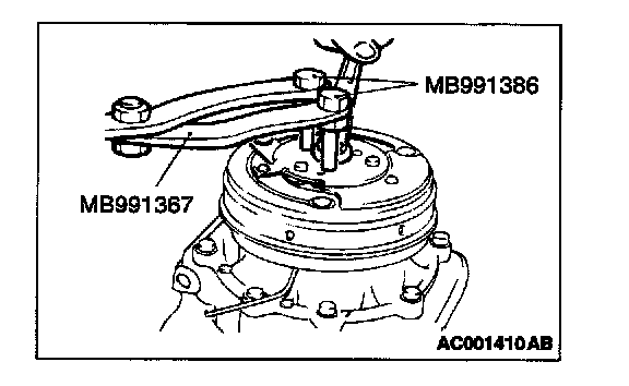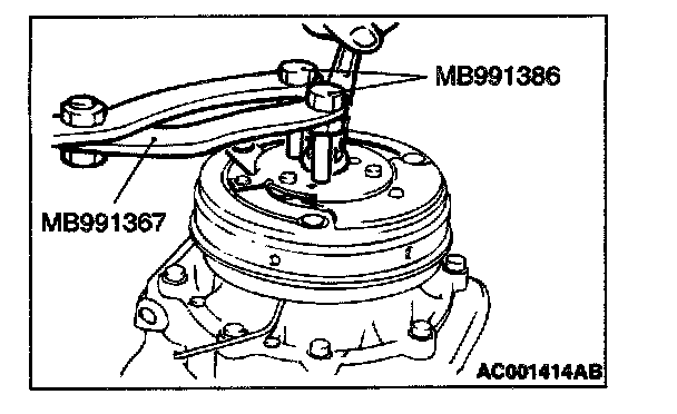 Use special tools MB991367 and MB991386 to hold the magnetic clutch, and remove the nut.