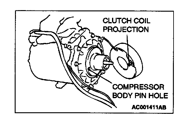 When installing the clutch coil to the A/C compressor body, install so that the pin hole of the A/C compressor body and the clutch coil projection are aligned.