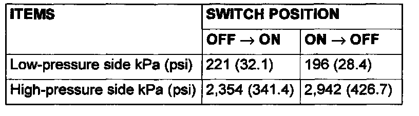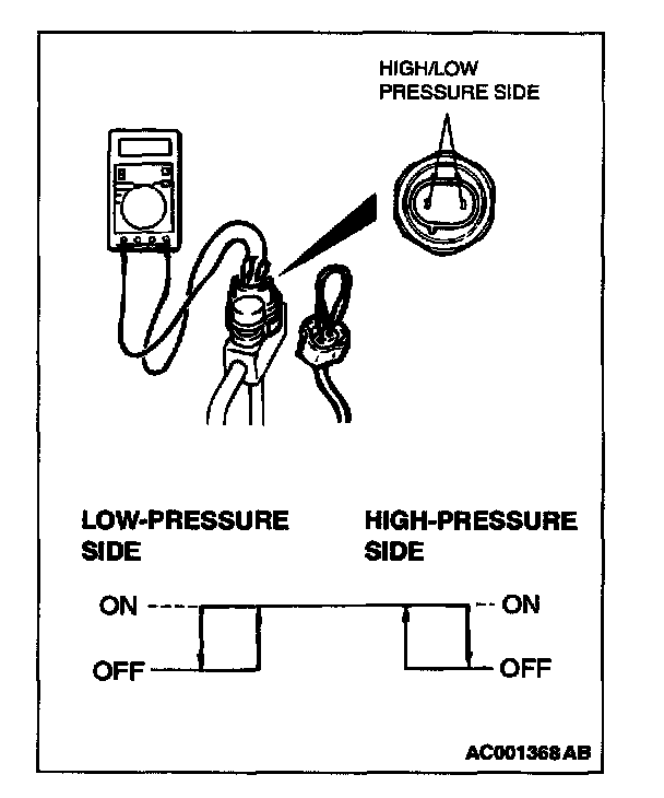 3. When the high/low pressure sides of the dual pressure switch are at operation pressure (ON) and there is continuity between the respective terminals, then the condition is normal. If there is no continuity, replace the switch.