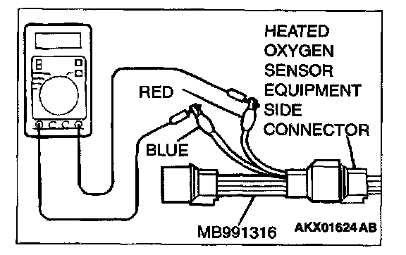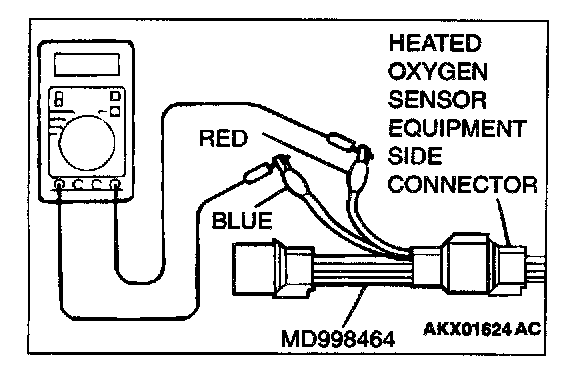 1. Disconnect the heated oxygen sensor connector and connect special tool MD998464 to the connector on the heated oxygen sensor side.