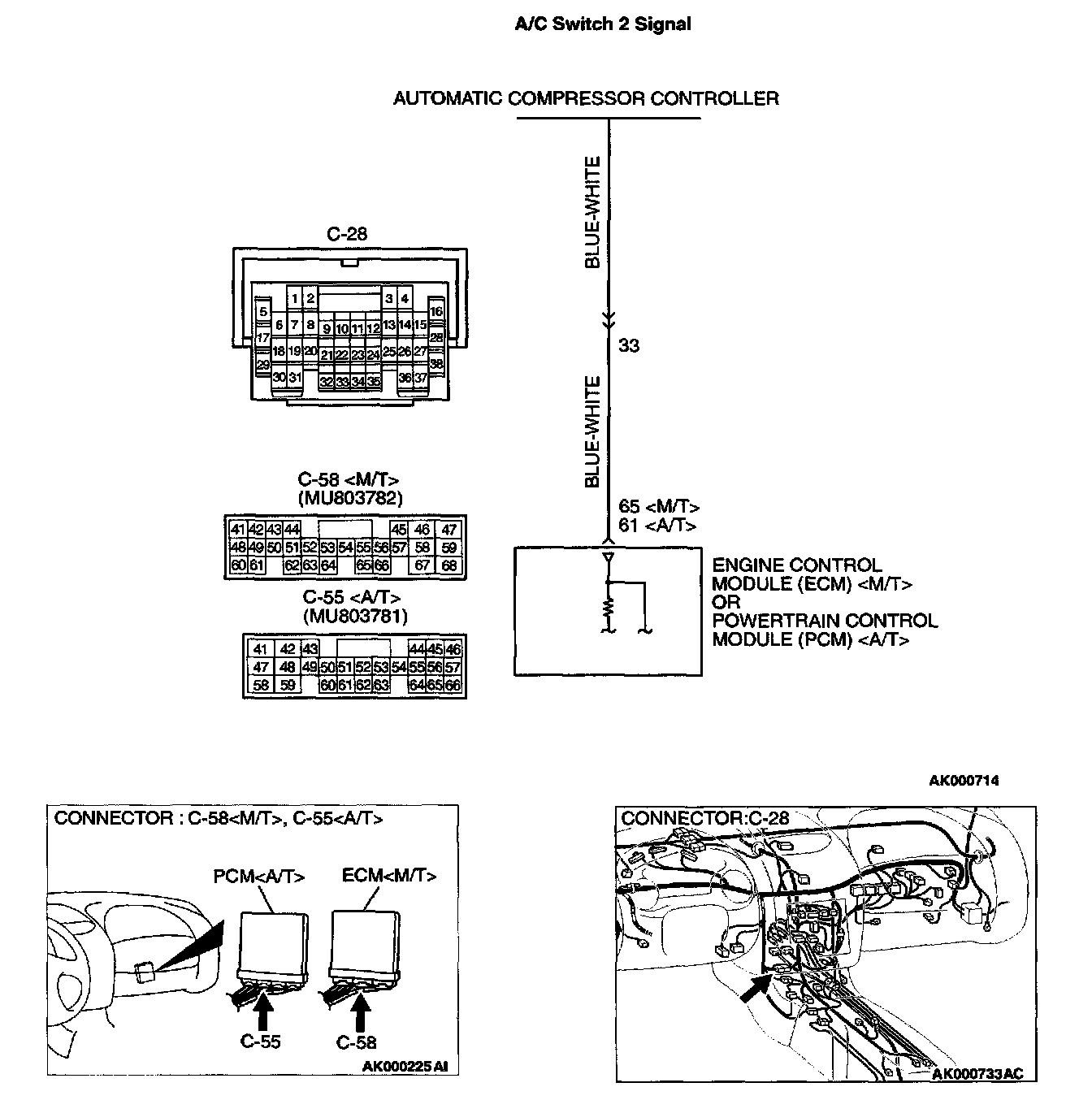 - The automatic compressor-ECU detects how the air conditioning is applying load to the engine, and converts the information to a voltage signal (High voltage = low load, Low voltage = high load). This voltage signal is called "A/C switch 2 signal". The ECM