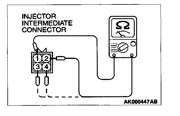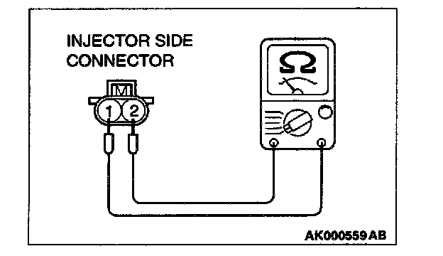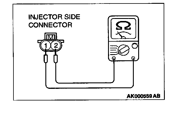 2. Measure the resistance between each injector side connector terminals 1 and 2.