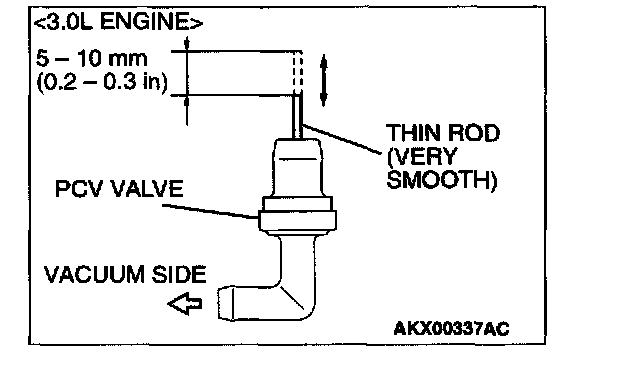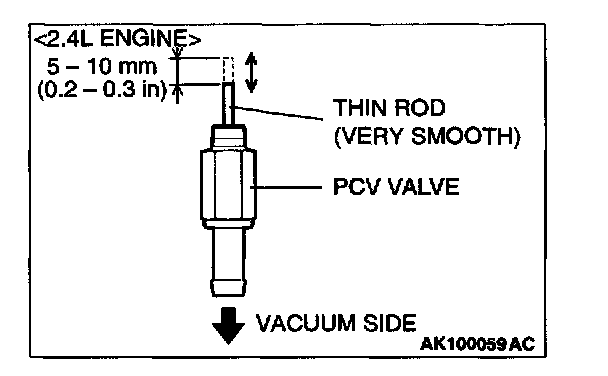 1. Hold the PCV valve with the vacuum side down. Insert a thin rod, and using light pressure, depress the end of the PCV valve spring by 5 - 10 mm (0.2 - 0.3 inch). Release pressure on the rod to see if the PCV valve spring will lift the rod to its original position.