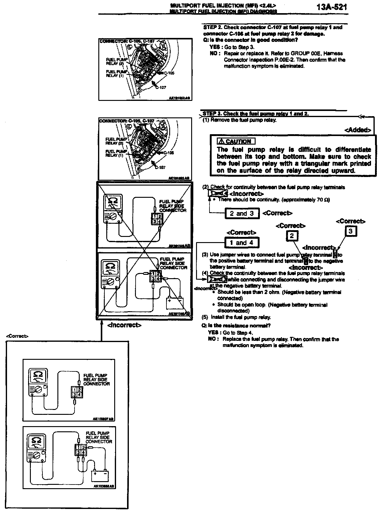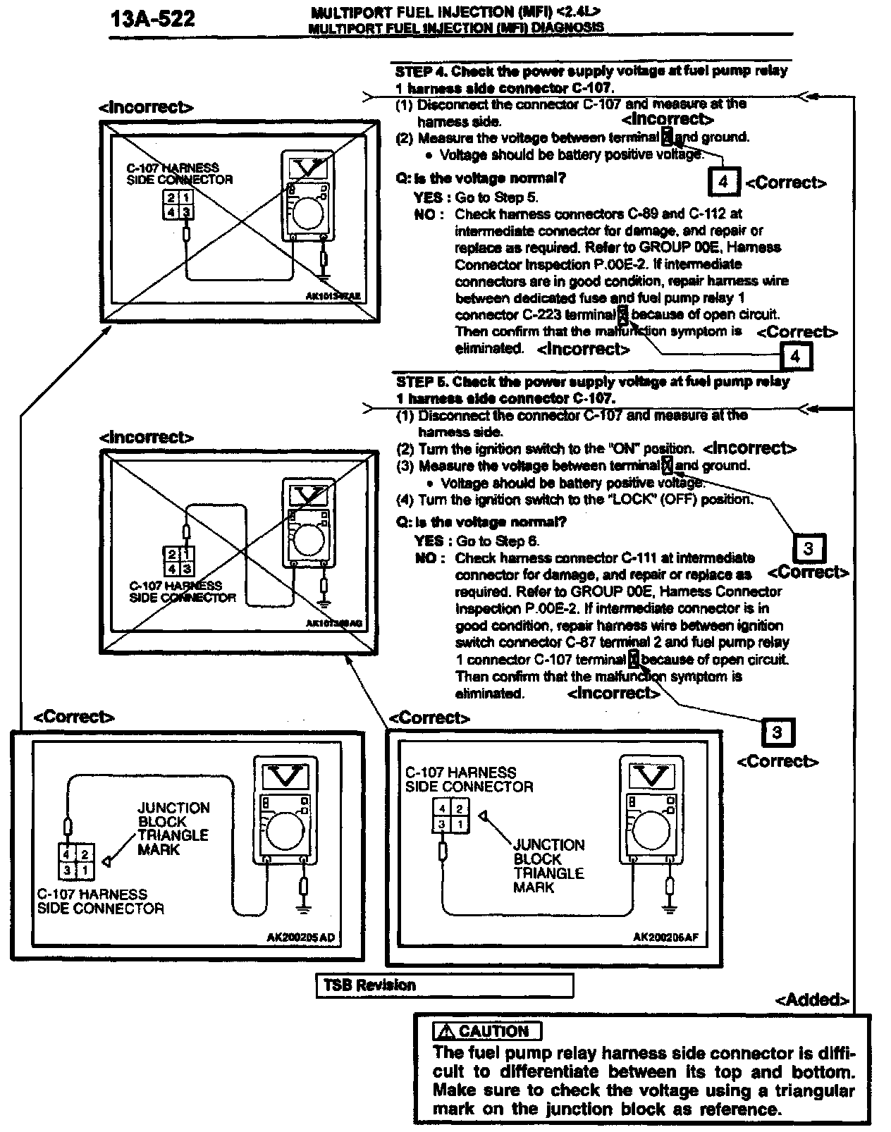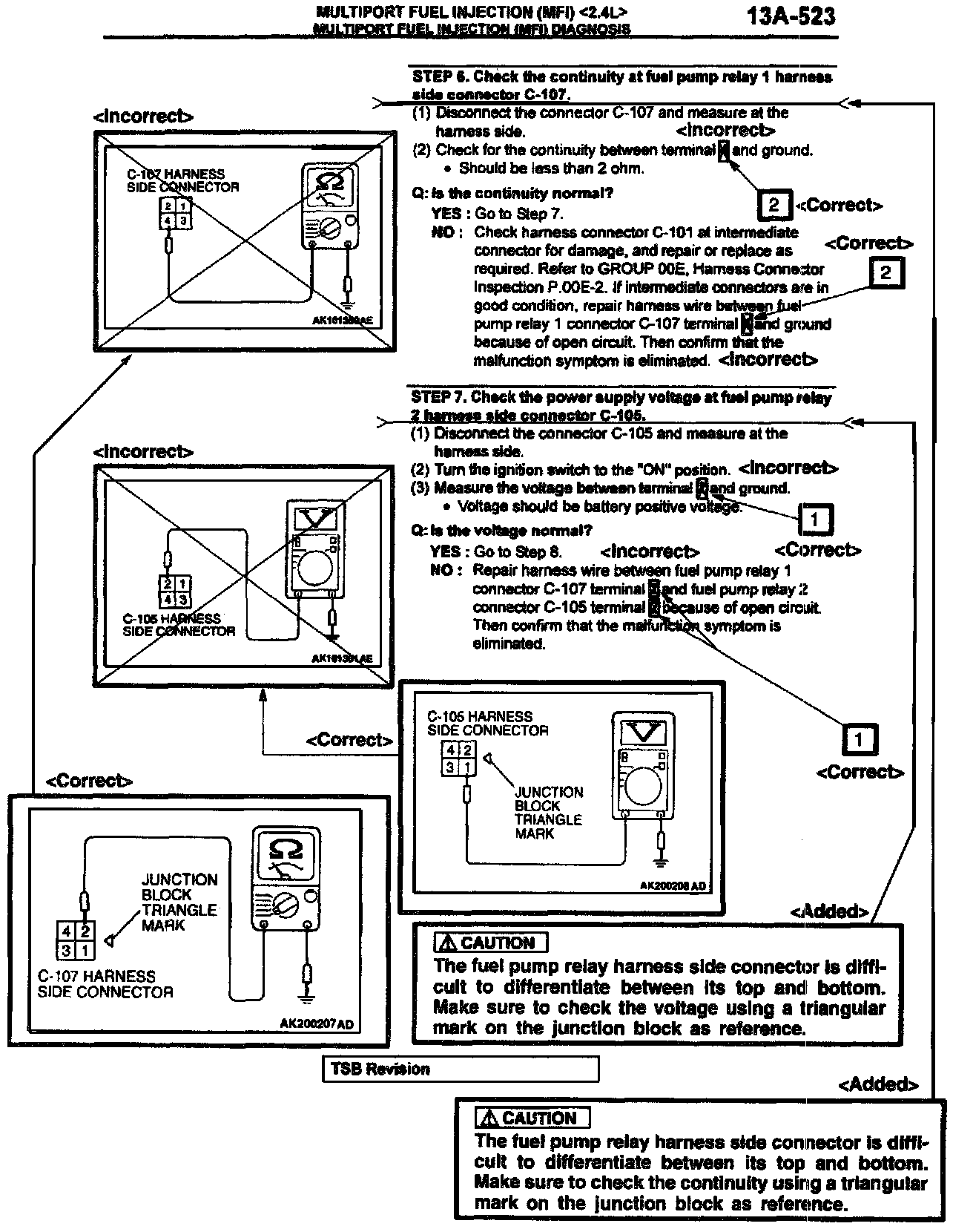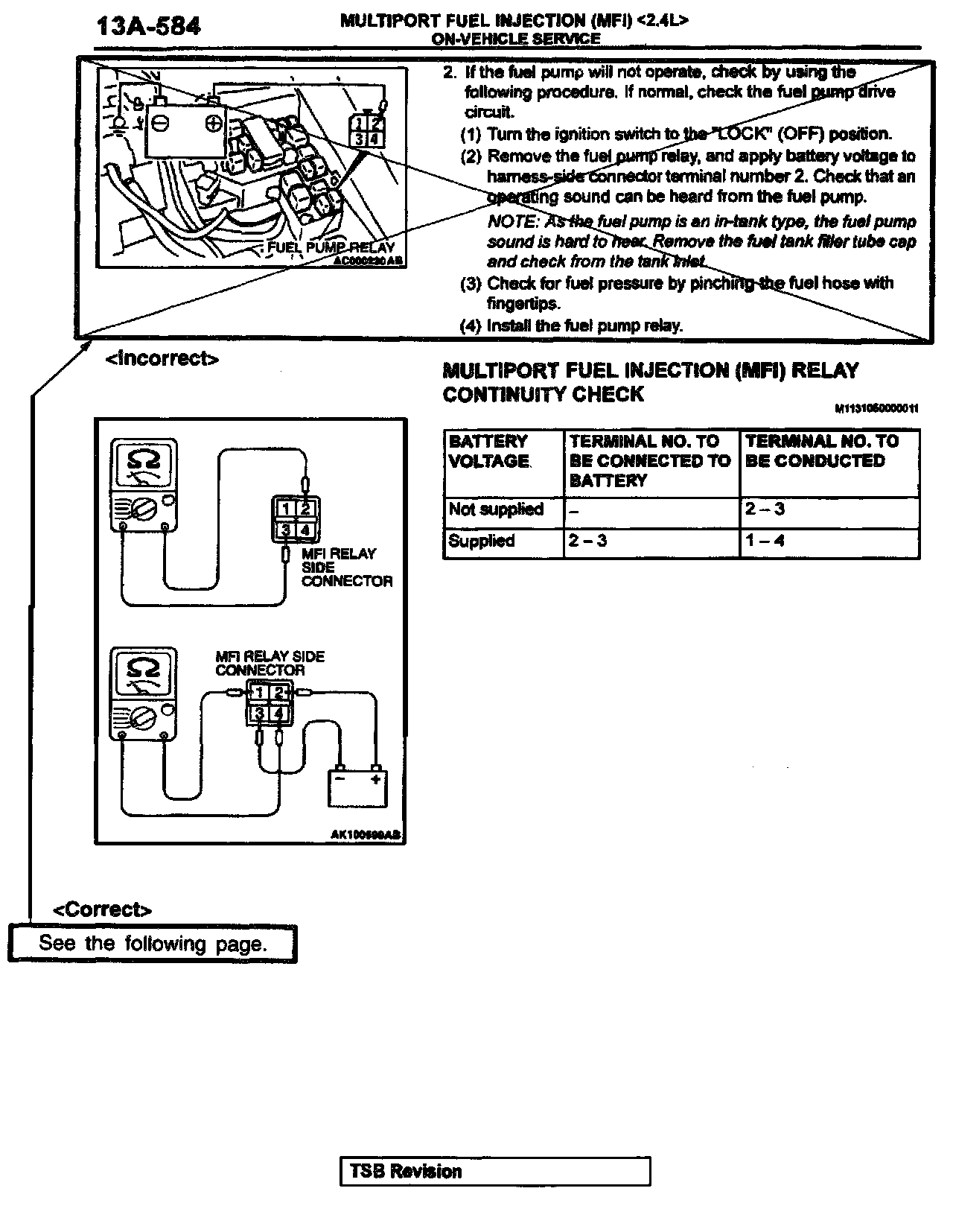 2002 Eclipse/Eclipse Spyder Service Manual, Volume 1, Page 13A-583. Correct the fuel pump relay terminal numbers and add the new caution statement as shown. Delete the indicated illustration and replace it with the new illustration shown.