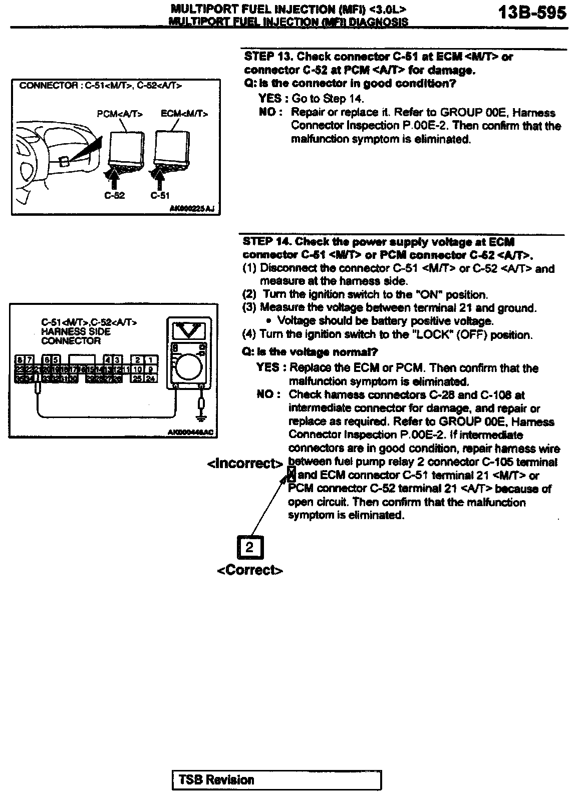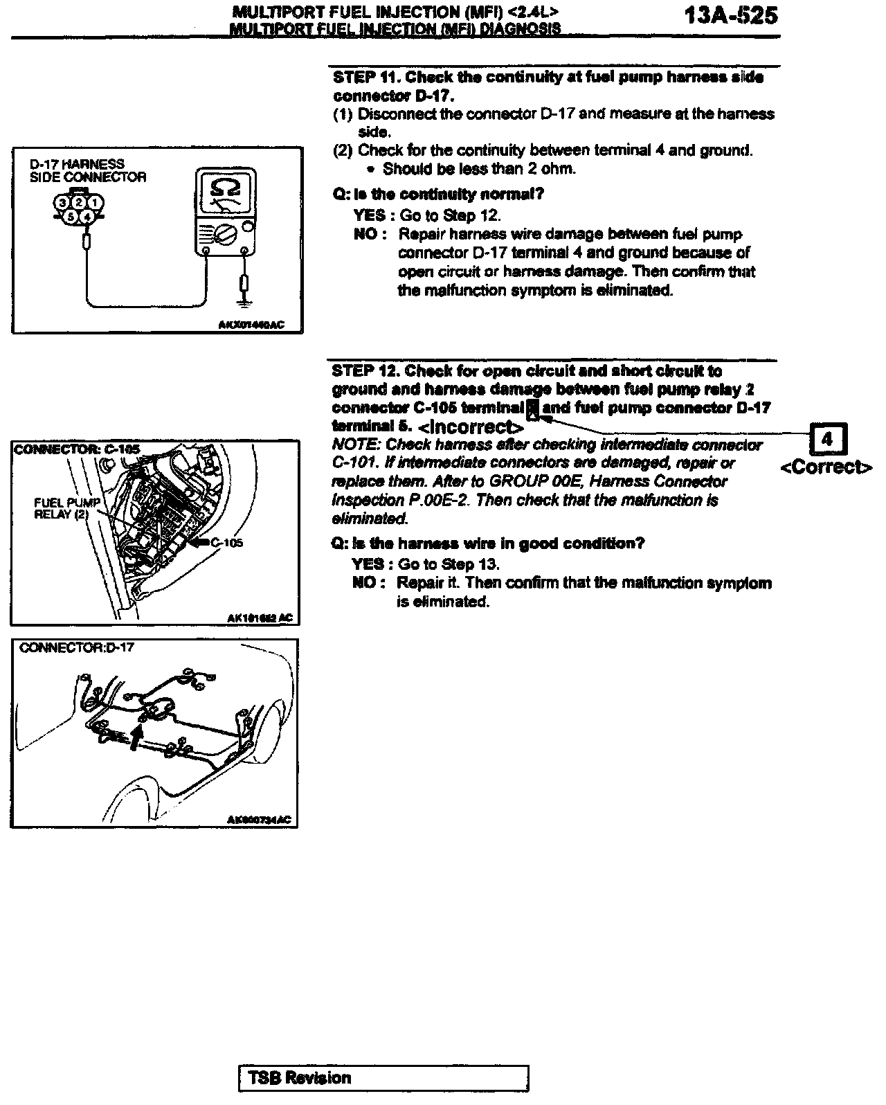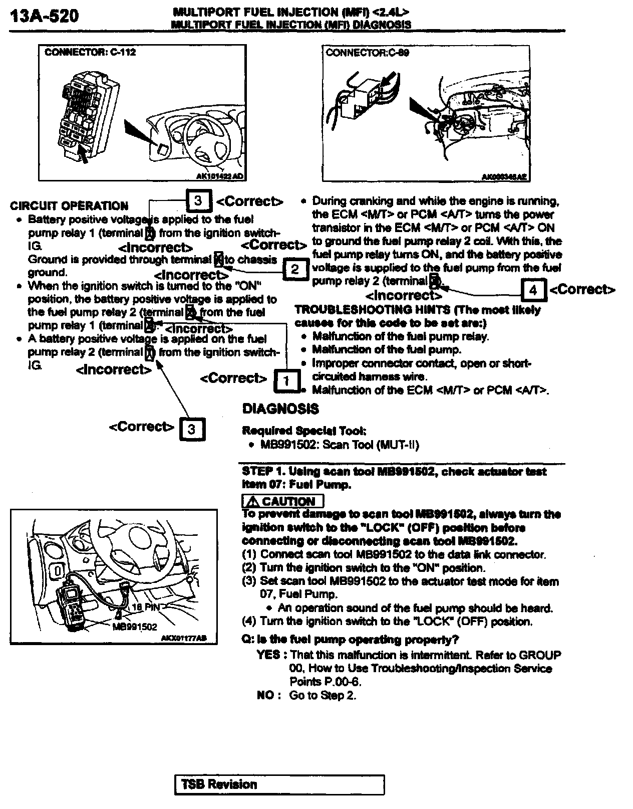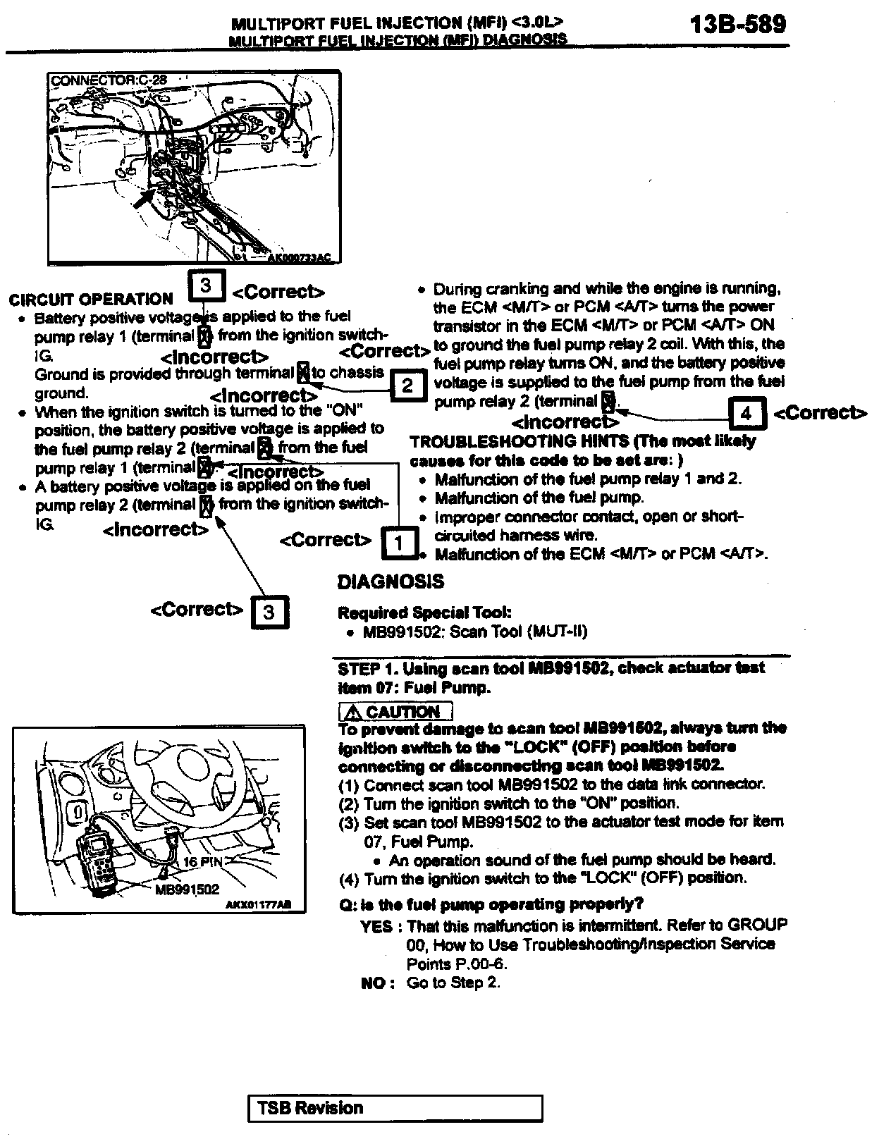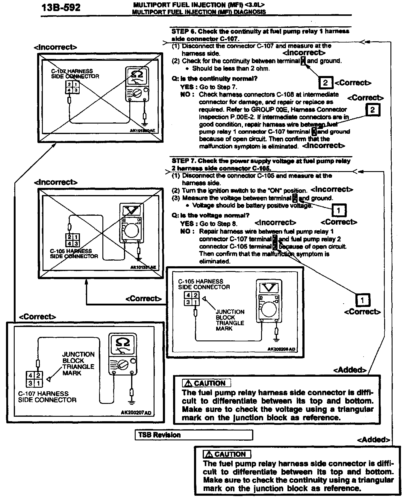 2002 Eclipse/Eclipse Spyder Service Manual, Volume 1, Page 13A-583. Correct the fuel pump relay terminal numbers and add the new caution statement as shown. Delete the indicated illustration and replace it with the new illustration shown.