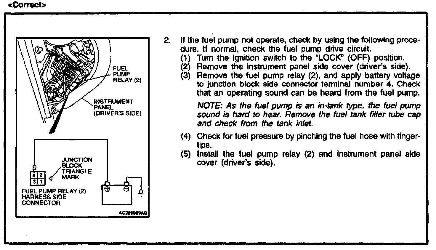 Correct the fuel pump relay terminal numbers and add the new caution statement as shown. Delete the indicate illustration and replace it with the new illustration shown.